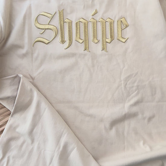 The back features a bold 3D embroidered “Shqipe”, giving it depth, texture, and presence — a tactile reminder of strength and heritage. On the back we have added a signature vertical woven label, featuring a traditional Albanian pattern, runs from the top of the neckline down the back — a refined detail that carries heritage through every stitch. While the front, the initials “PS” (Prime Shuffle) are rendered in flat embroidery, a subtle signature marking authenticity and craft.