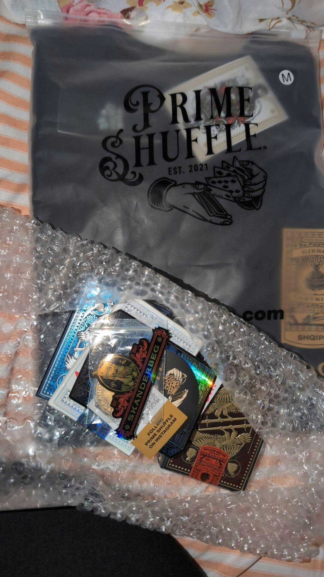 I bought this bundle for my husband and a unique New Years Eve gift (Albanians be like, if you know you know). I am so happy that I chose the bundle because I get to keep a deck of cards for myself!!! He is in love with his decks, the shirt, the coin and the stickers. The coin is such a nice touch, my husband immediately picked up the coin before getting into the other stuff. The stickers are gorgeous and I love the hand written card as a thank you note! Very thoughtful! He hasn't tried the shirt yet but I did! The quality is phenomenal, super soft on the skin and vibrant colours! I am happy to see that all materials chosen are actual high quality. You pay what you get and (trust me) you get more! Lots of love from Canada!